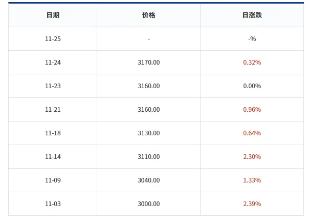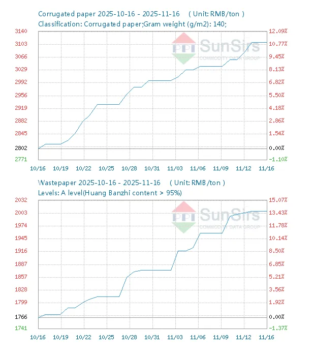 140g / m²မြှောင်းပုံစာတမ်းအတွက် 2025 ခုနှစ်အောက်တိုဘာ 16 ရက်မှနိုဝင်ဘာ 16 ရက်အကြားဈေးနှုန်းများမှာ 12.09% အထိမြင့်တက်ခဲ့သည်။ ပိုမိုကြာရှည်စွာ 0 င်းဒိုးတွင် (သြဂုတ်လ 27 ရက်နေ့အထိ) တွင် 20.99% တိုးပွားလာသည်။ နို 0 င်ဘာလ 24 ရက်နေ့တွင်နောက်ဆုံးဈေးနှုန်းသည်တစ်တန်ကန်ဒေါ်လာကျပ် 3170 RMB သို့ရောက်ရှိခဲ့သည်။